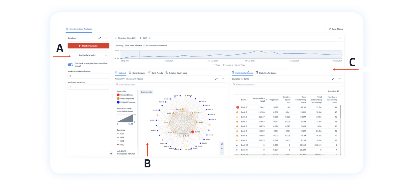 Figure 2 shows a snapshot of the user interface using synthetic data mimicking the statistical properties of real interbank loan data. It consists of different features, such as Network Based Stress Testing widget (A), Large Network Visualization widget (B) and Drill-down Groups for Arcs (C). The functionalities of each feature on the dashboard will be explained in the next section.