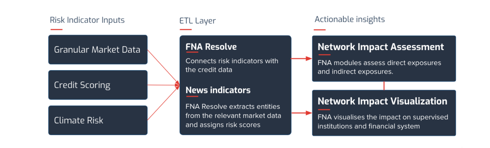 With the solution, supervisors and regulators can gain complete visibility of the structure of interbank networks, gain an understanding of emerging credit risk indicators and assess the potential systemic risk that may emerge from the current events. As summarized in Figure 1, the solution takes granular levels of interbank loan transactions and bank’s capital as inputs. Using FNA’s Retrieve and Resolve technology, input data is ingested from databases, validated, cleaned, and then transformed for further analysis. Actionable insights are then provided through both network impact assessments and network impact visualizations.