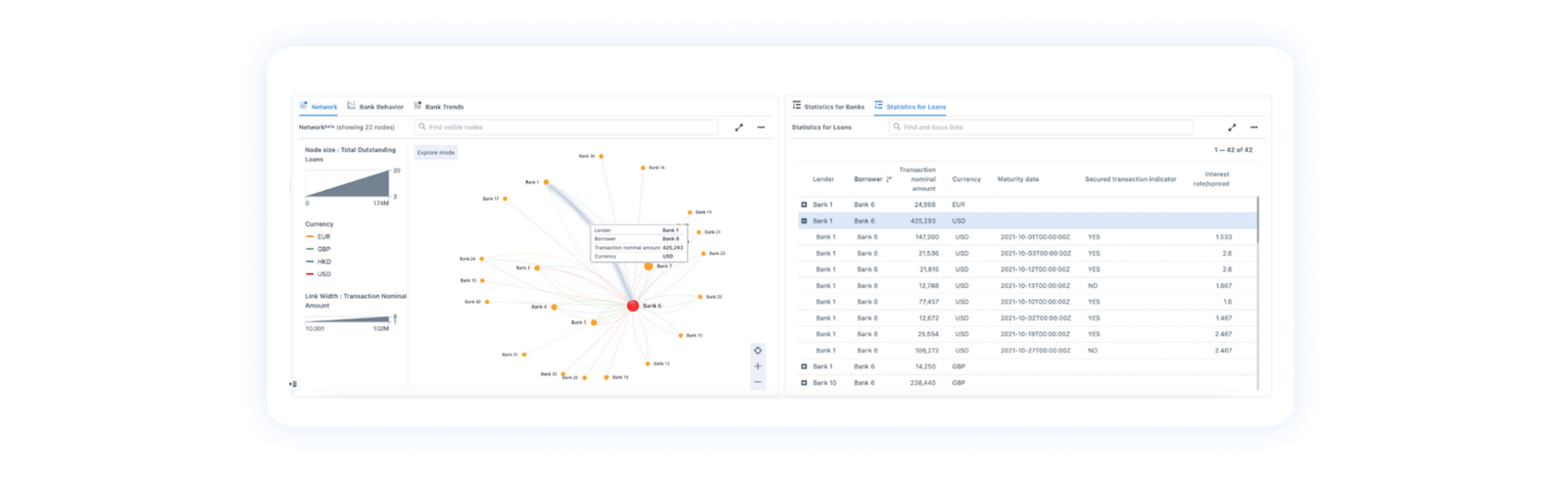 A highlighted link in Figure 6 represents a loan exposure from “Bank 1” to “Bank 6,” with a total outstanding balance of 425,293 USD. When we expand the drill-down groups by clicking the plus sign on the right table, we can see that the highlighted link is actually made up of 8 individual loans. For each loan, detailed information regarding the maturity date, secure transaction information, and interest rate/spread will be provided.