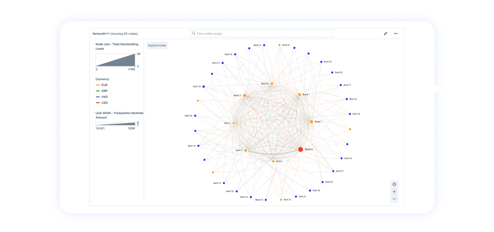In Figure 5, we leverage the use of the FNA large network visualization feature in conjunction with FNA’s built-in core-periphery layout algorithms to create an interbank loan network. From the network, we can see a number of banks lend money to “Bank 6” (red node). If “Bank 6” loses some of its equity, it may no longer be able to pay its lenders. As an impact of this shock, firstly, banks with direct exposure to “Bank 6”, which are denoted by orange color nodes, will suffer some losses. The lenders of these banks, which are denoted by blue color nodes, will then also suffer some reduction in their interbank lending assets due to contagion in the interbank market.