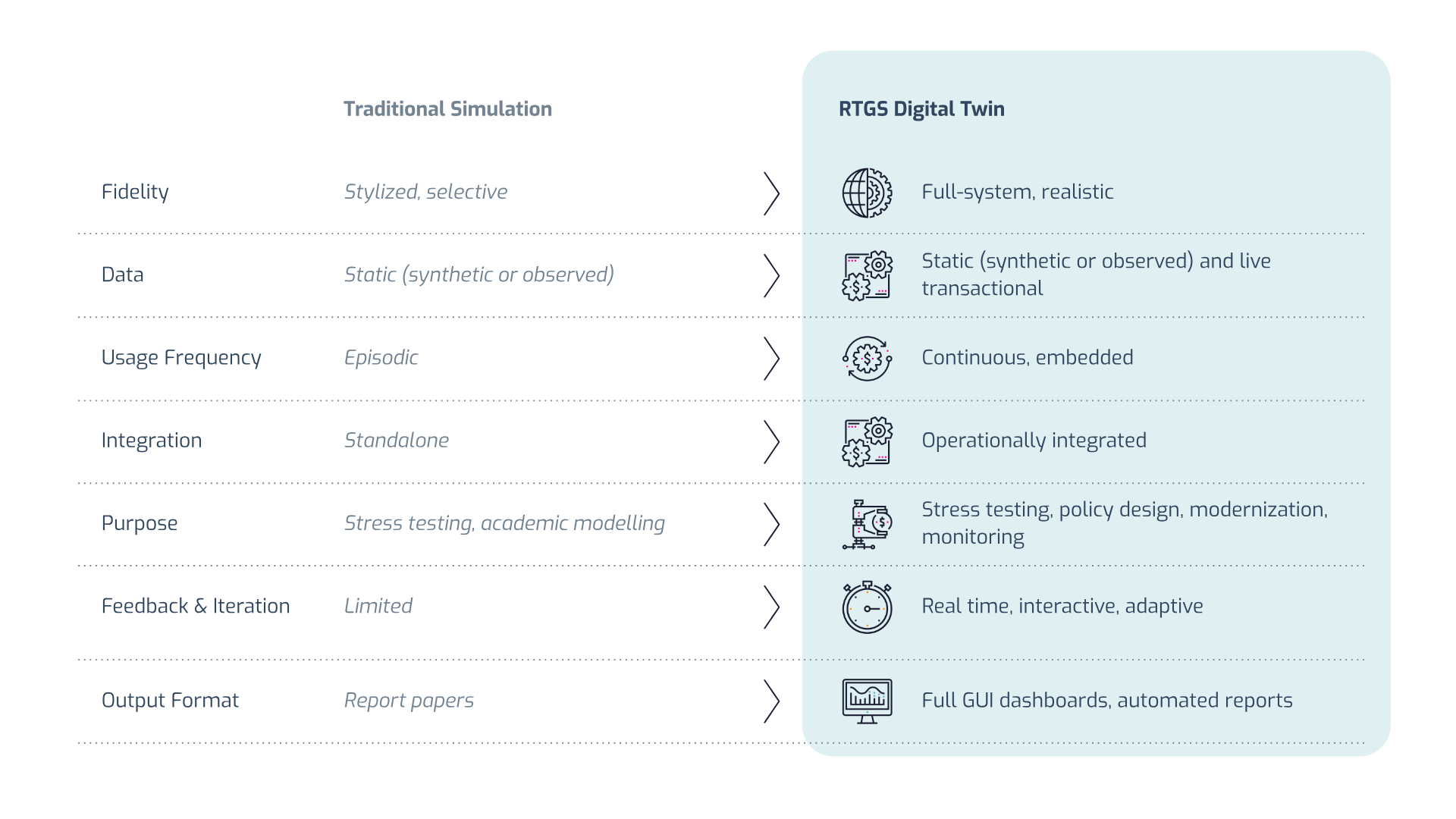 This table summarizes the main differences between traditional RTGS simulation and RTGS digital twins:
